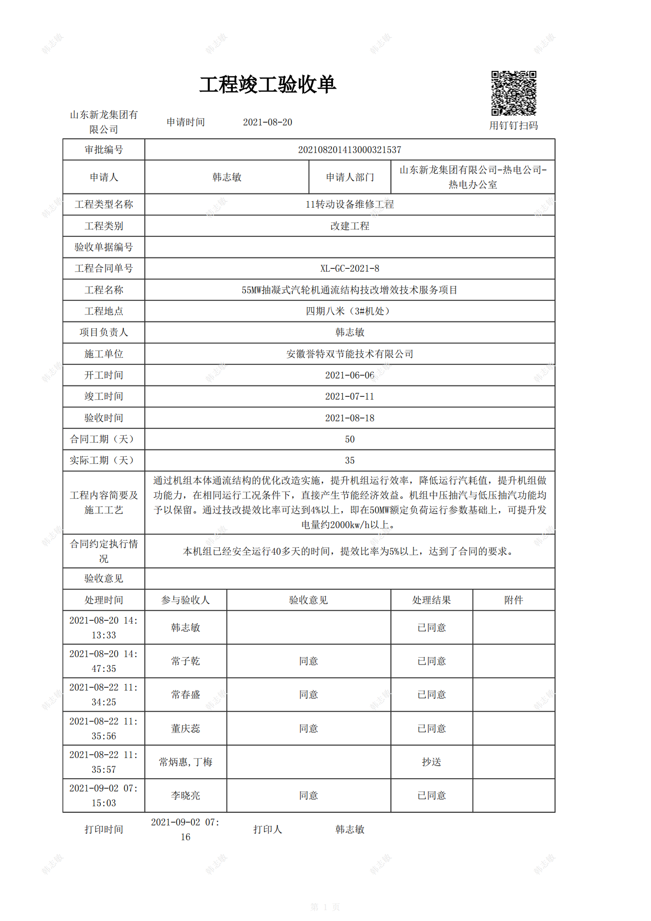 我公司EPC總包節能改造服務項目——山東新龍集團55MW高壓抽凝式汽輪機組通流改造節能提效項目順利通過工程驗收,機組各項技術指標均正常、穩定,綜合節能提效比例達5%以上,實測值7.3%;