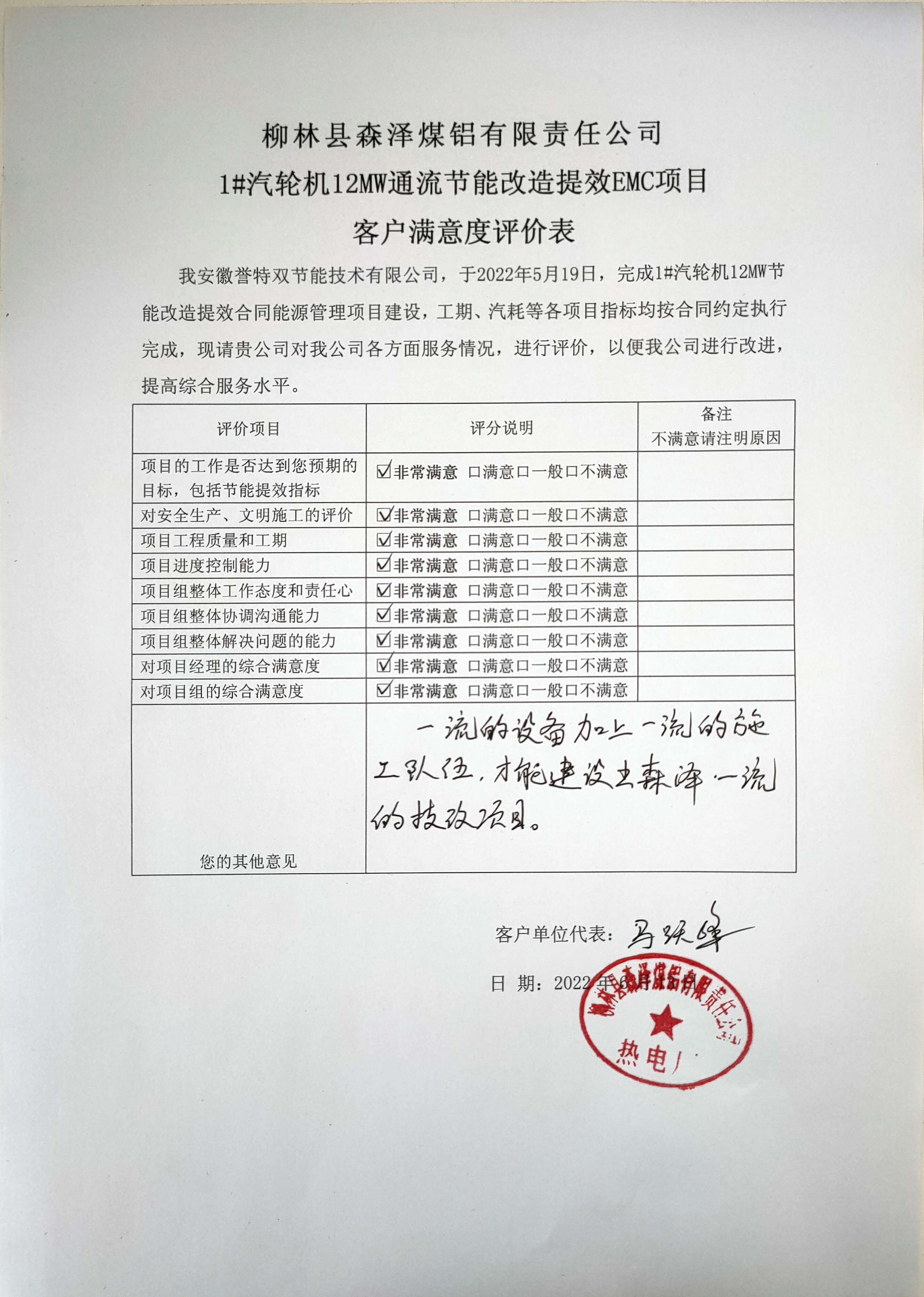 我公司仍將以“工業節能、永無止境、精益服務、合作共贏”的企業宗旨,不負客戶信任與托付,將該項目同樣建設成為標桿業績,實現合作共贏,體現企業責任,為國家雙碳戰略貢獻力量!