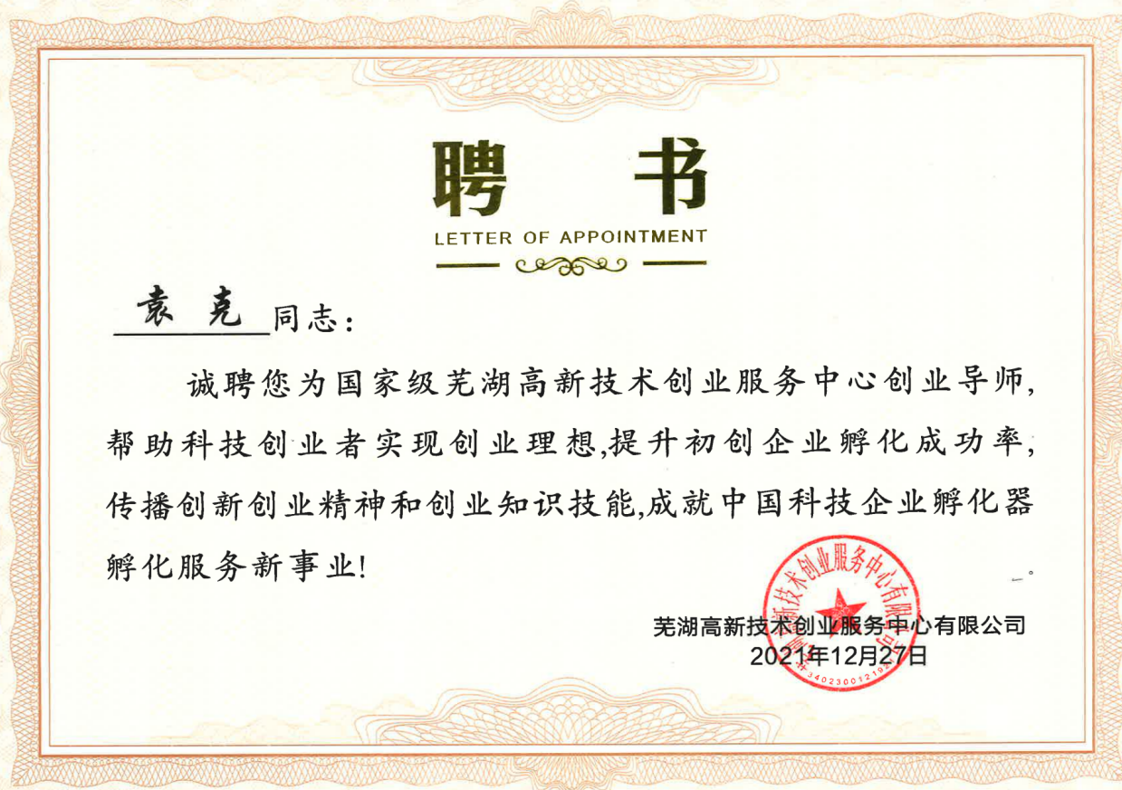 近日,我公司總經理袁克同志被聘為國家級蕪湖高新技術創業服務中心有限公司“創業導師”。