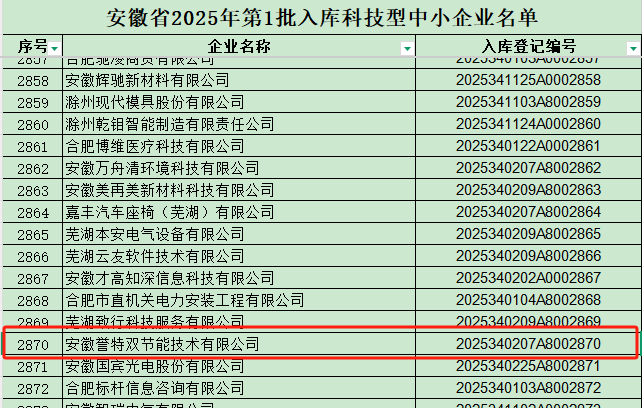 近日,安徽省科學技術廳公布了2025年第一批入庫科技型中小企業(yè)名單,安徽譽特雙節(jié)能技術有限公司憑借其在節(jié)能技術領域的突出創(chuàng)新實力和豐富的技術積累,入選科技型中小企業(yè)庫,成為安徽省科技創(chuàng)新主力軍中的一員。